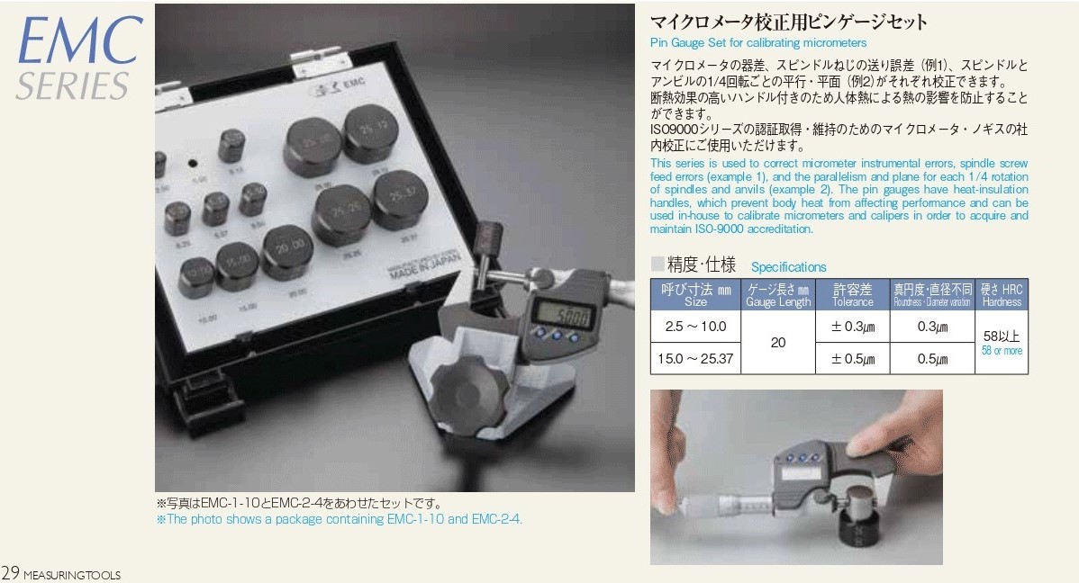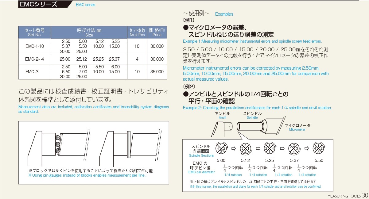 This series is used to correct micrometer instrumental errors, spindle screw feed errors (example 1), and the parallelism and plane for each 1/4 rotation of spindles and anvils (example 2). The pin gauges have heat-insulation handles, which prevent body heat from affecting performance and can be used in-house to calibrate micrometers and calipers in order to acquire and maintain ISO-9000 accreditation.
